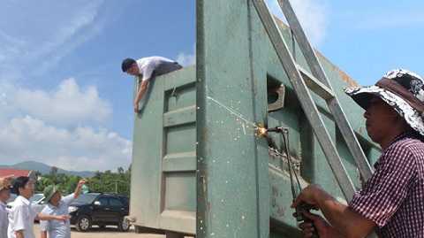 | Sau khi đo thùng xe tải 37C-03488 và phát hiện thùng xe bị cơi nới, Thứ trưởng Lê Đình Thọ chỉ đạo cắt ngay tại hiện trường - Ảnh: NK |