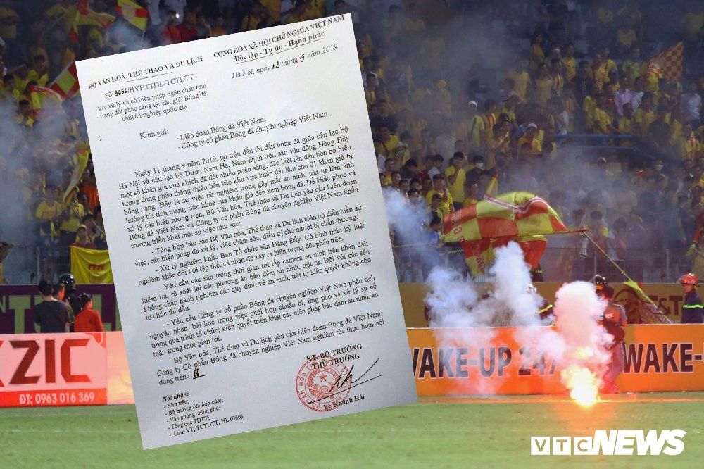 Công văn nêu rõ: “Ngày 11/9, tại trận đấu bóng đá giữa câu lạc bộ Hà Nội và câu lạc bộ Dược Nam Hà Nam Định trên sân vận động Hàng Đẫy một số khán giả quá khích đã đốt nhiều pháo sáng, đặc biệt lần đầu tiên có hiện tượng dùng pháo thăng thiên bắn vào khu vực khán đài làm cho 1 khán giả bị bỏng nặng.