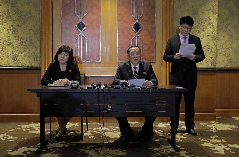 Ngoại trưởng Triều Tiên Ri Yong-ho và Thứ trưởng Ngoại giao Triều Tiên Choe Son-hui trong buổi họp báo tại khách sạn Meliá lúc 0h 1/3. (Ảnh: SBS)