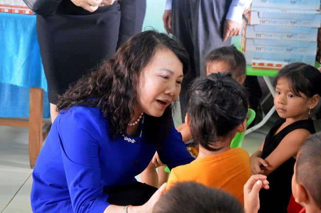 Thứ trưởng Nguyễn Thị Nghĩa thăm hỏi học sinh tại trường Mầm non xã Quảng Phú, Quảng Trạch, Quảng Bình. Ảnh: Văn Được.