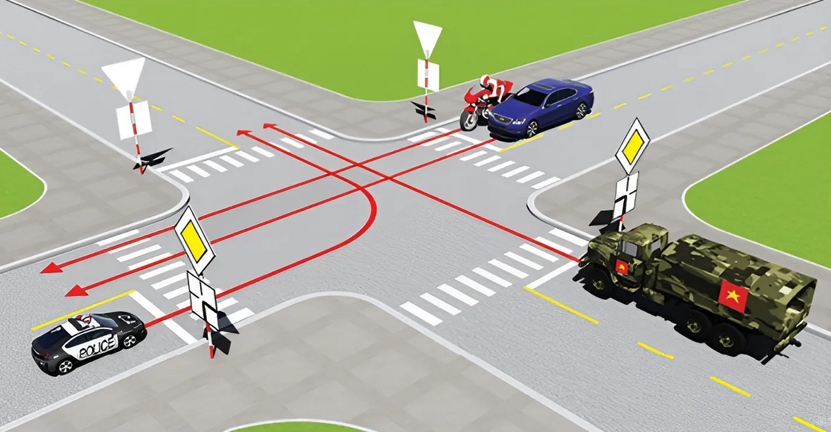 Như vậy, trong trường hợp này, xe quân sự được đi trước xe công an. Sau khi 2 loại xe ưu tiên đi qua, xe con và mô tô mới được đi. - C