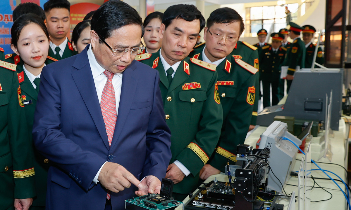 Thủ tướng Phạm Minh Chính tham quan khu trưng bày các sản phẩm nghiên cứu khoa học của Học viện Kỹ thuật quân sự. (Ảnh: VGP)