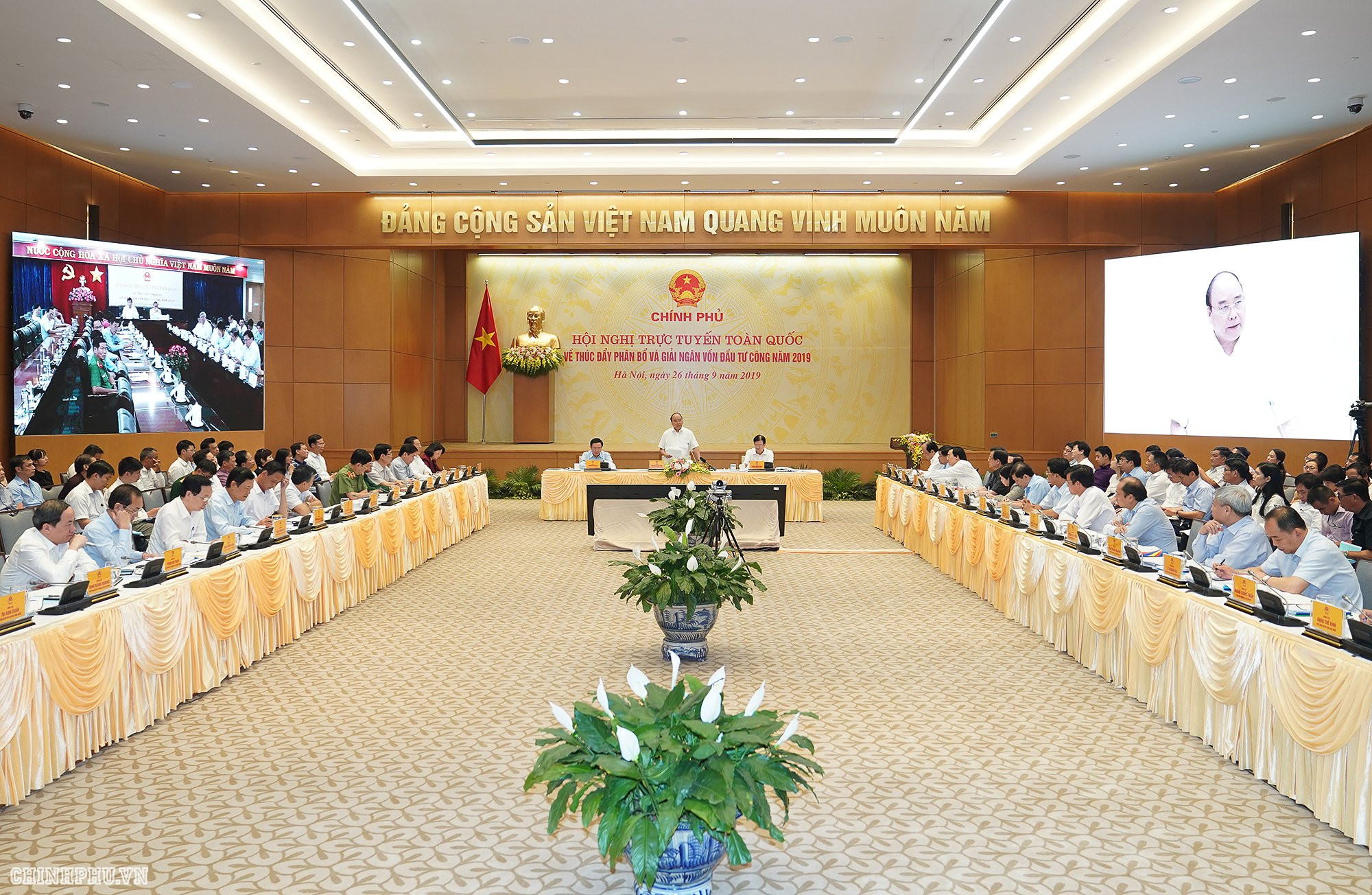 Thủ tướng Chính phủ Nguyễn Xuân Phúc chủ trì Hội nghị trực tuyến toàn quốc về thúc đẩy phân bổ và giải ngân vốn đầu tư công năm 2019 sáng 26/9. Ảnh: Chinhphu.vn