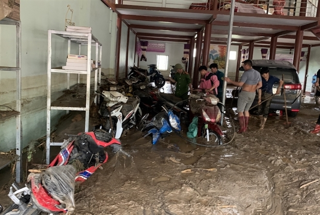 Lực lượng tại chỗ, dân quân, công an huyện giúp bà con dọn dẹp bùn đất. (Ảnh: VOV.VN)