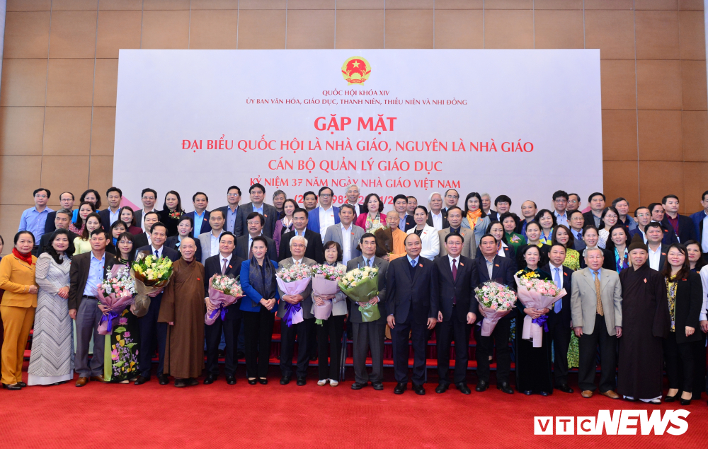 Thủ tướng Nguyễn Xuân Phúc cùng Chủ tịch Quốc hội Nguyễn Thị Kim Ngân tặng hoa chúc mừng các lãnh đạo đã và đang công tác trong ngành giáo dục nước nhà.