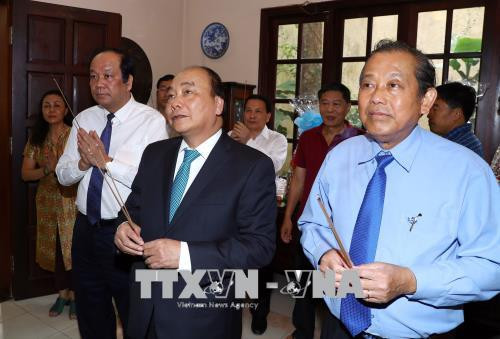 Thủ tướng Nguyễn Xuân Phúc đến thăm Nhà tưởng niệm nguyên Quyền Chủ tịch nước, Luật sư Nguyễn Hữu Thọ. (Ảnh: Thống Nhất/TTXVN)