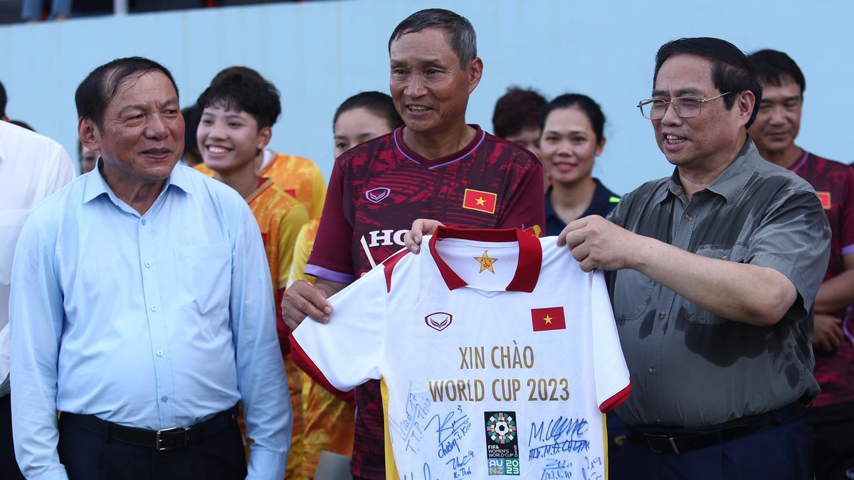 "Tôi rất tự hào về các cô gái kim cương", Thủ tướng Phạm Minh Chính nói với đội tuyển nữ Việt Nam chiều nay (3/7). Thủ tướng cùng Bộ trưởng Bộ VHTTDL Nguyễn Văn Hùng, lãnh đạo Tổng cục TDTT và Liên đoàn bóng đá Việt Nam đến Trung tâm đào tạo bóng đá trẻ Việt Nam động viên thầy trò HLV Mai Đức Chung trước khi đội tuyển lên đường sang New Zealand tham dự World Cup nữ 2023.