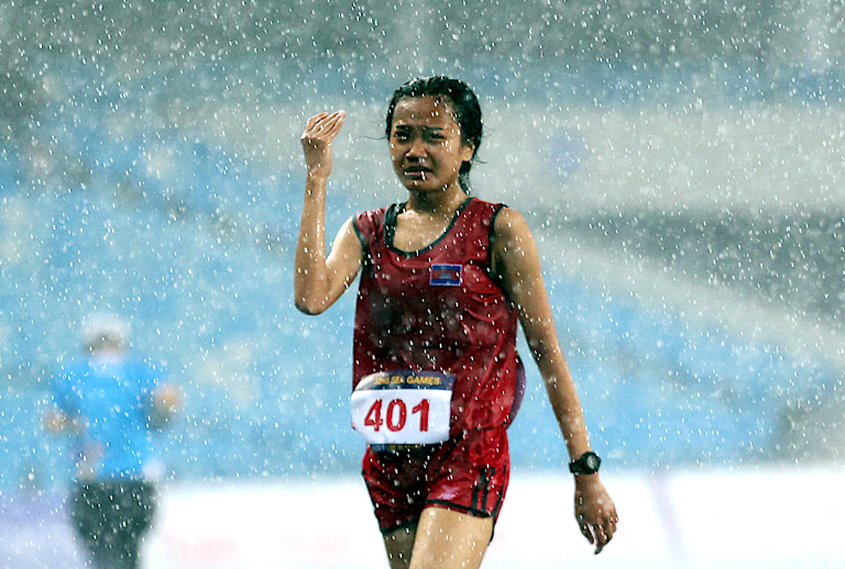 VĐV Campuchia vừa chạy vừa khóc dưới mưa.