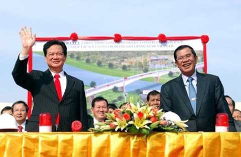 | Thủ tướng Nguyễn Tấn Dũng và Thủ tướng Campuchia Hun Sen dự lễ khởi công cầu Long Bình-Chrey Thom, cây cầu nối tỉnh An Giang (Việt Nam) và tỉnh Kandal (Campuchia). Ảnh: VGP |
