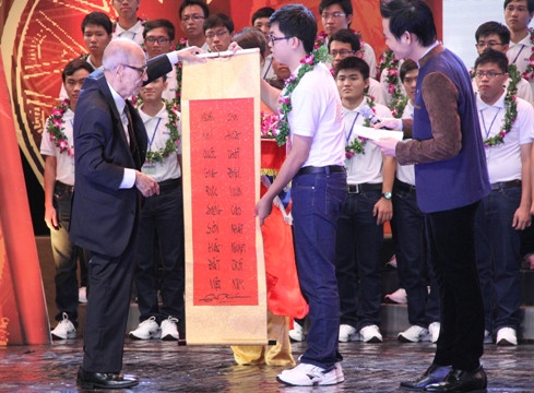 | Giáo sư, Nhà giáo Nhân dân, Anh hùng Lao động Vũ Khiêu đã tặng các em học sinh xuất sắc một câu đối ý nghĩa |