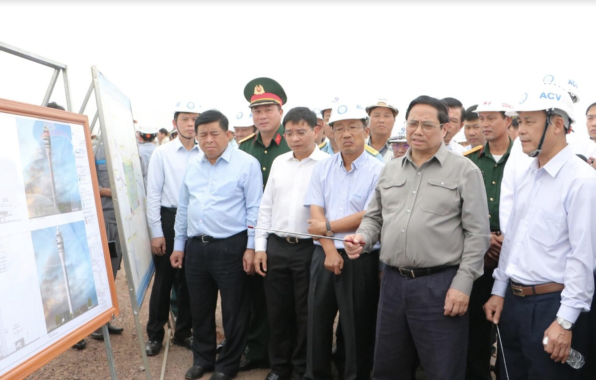 Tại hiện trường, Thủ tướng thị sát thi công các công trình, dự án thành phần như nhà ga hành khách; nhà ga hàng hóa, khu bảo trì; đường cất hạ cánh, đường lăn, sân đỗ máy bay, giao thông nội cảng; công trình giao thông kết nối...