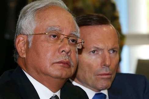 | Thủ tướng Malaysia Razak (trái) và Thủ tướng Australia Abbott nghe thông báo tóm tắt về tiến độ tìm kiếm MH370 |