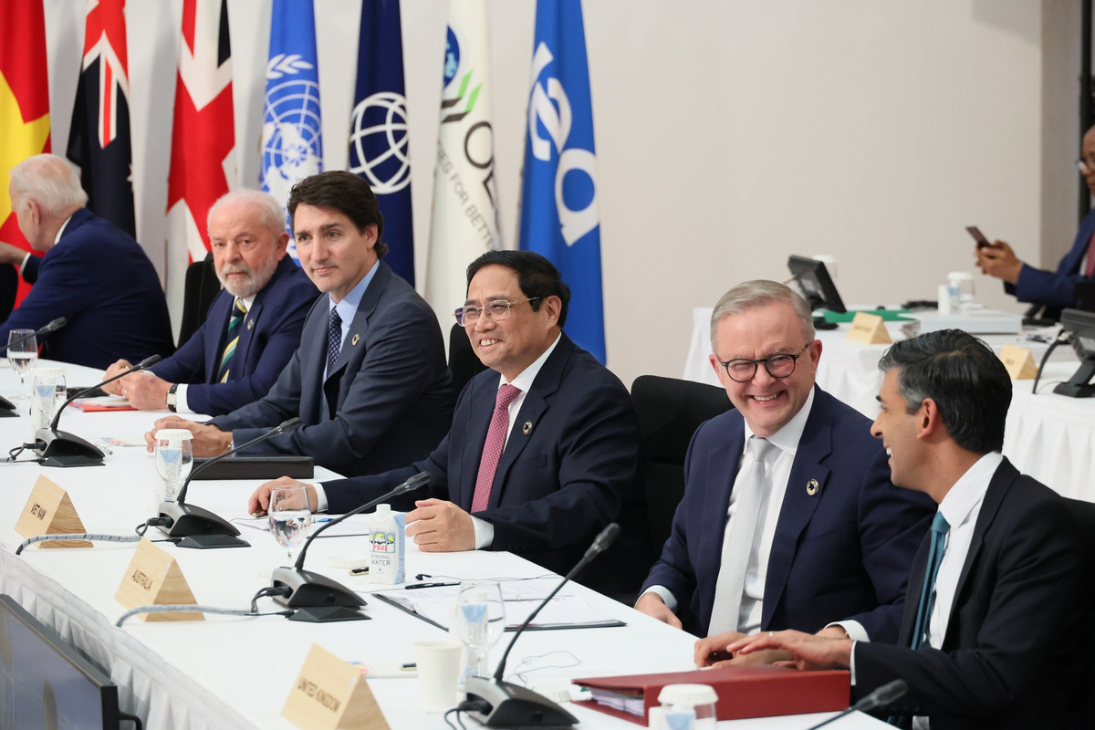 Trong phát biểu quan trọng tại phiên họp, Thủ tướng Phạm Minh Chính trân trọng cảm ơn Chính phủ Nhật Bản và Thủ tướng Kishida Fumio về những tình cảm tốt đẹp, sự hiếu khách và tổ chức, thu xếp hết sức chu đáo cho Hội nghị thượng đỉnh G7 mở rộng.