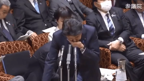 Trong đoạn video dài 9 giây, ông Abe ho 2 lần và phải lấy tay hoặc tay áo che miệng. Ông và một số thành viên Quốc hội ngồi sau ông không đeo khẩu trang.