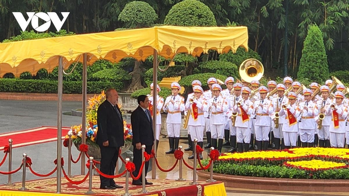 Thủ tướng Phạm Minh Chính mời Thủ tướng Cộng hòa Cuba Manuel Marrero Cruz duyệt đội danh dự Quân đội nhân dân Việt Nam; sau đó hai nhà Lãnh đạo giới thiệu thành phần Đoàn cấp cao hai bên tham dự lễ đón.