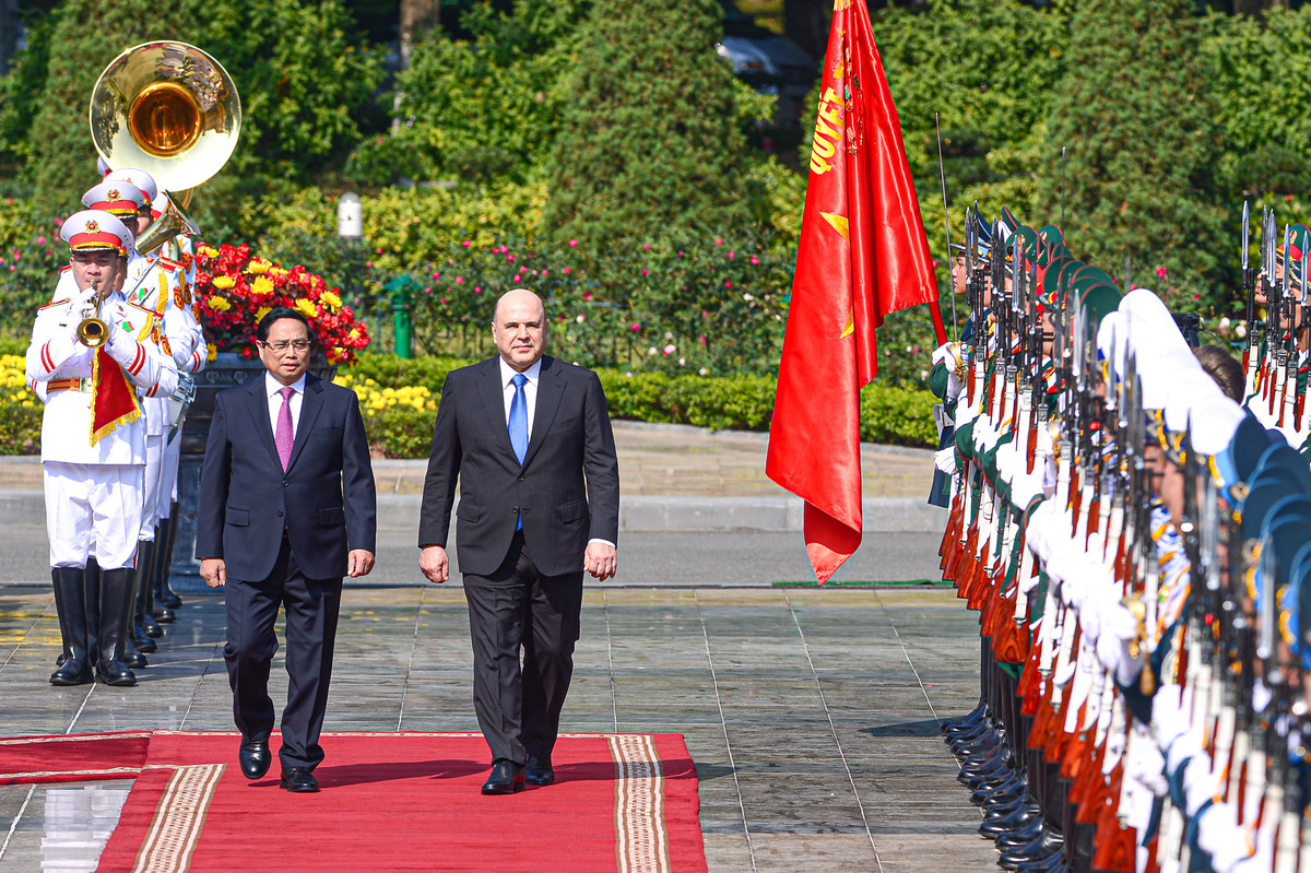 Thủ tướng Phạm Minh Chính và Thủ tướng Nga Mikhail Vladimirovich Mishustin duyệt đội danh dự Quân đội nhân dân Việt Nam.