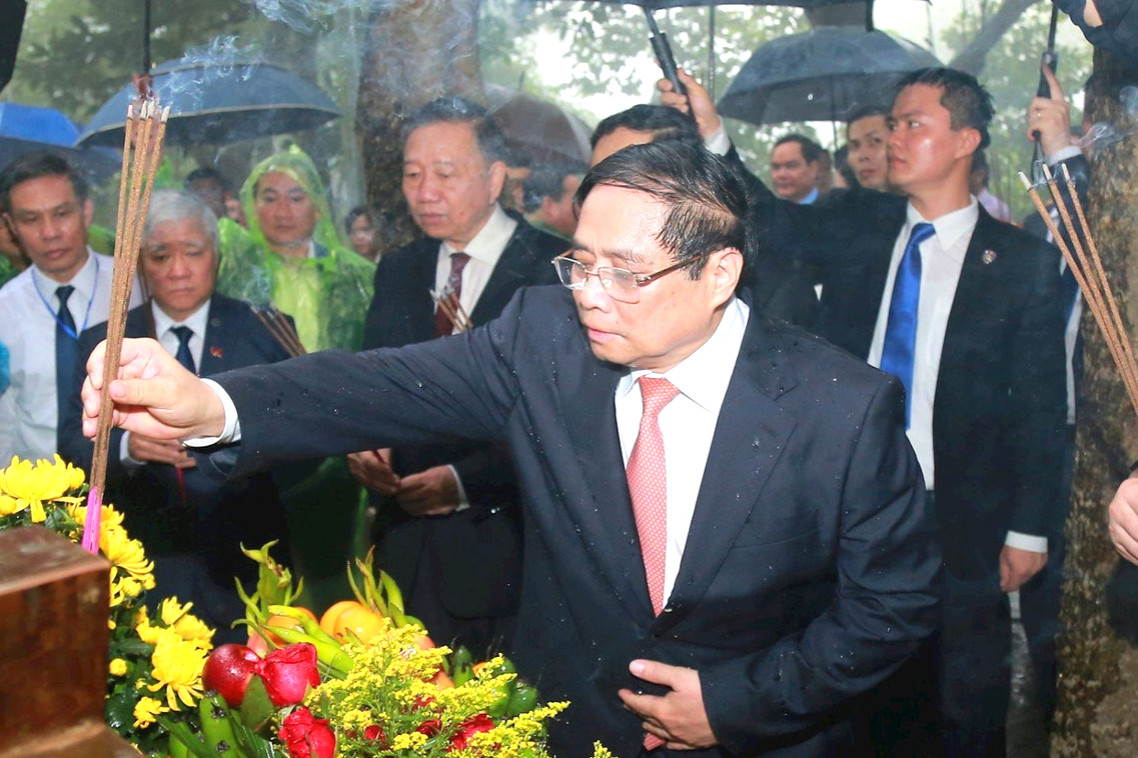 Trong không khí trang nghiêm, thành kính tri ân, Thủ tướng Phạm Minh Chính cùng các vị lãnh đạo Đảng, Nhà nước, tỉnh Phú Thọ… thành kính dâng hương, hoa, lễ vật tưởng nhớ, tri ân công đức của các Vua Hùng đã có công dựng nước, đồng thời cầu cho xã tắc thịnh vượng, quốc thái dân an, bách gia trăm họ vạn đại trường tồn.