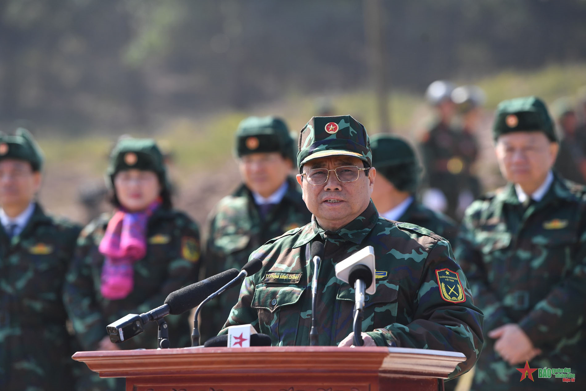 Thủ tướng Phạm Minh Chính tới dự, động viên các lực lượng tham gia chỉ đạo, theo dõi cán bộ, chiến sỹ Quân đoàn 12 diễn tập.