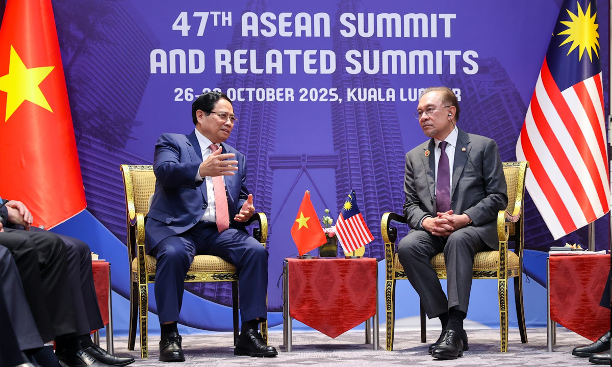 Vui mừng gặp lại Thủ tướng Anwar Ibrahim sau chuyến thăm chính thức Malaysia nhân dịp dự HNCC ASEAN lần thứ 46 (5/2025), Thủ tướng Chính phủ Phạm Minh Chính đánh giá cao các bước tiến lớn trong hợp tác kinh tế hai nước thời gian qua, theo đó kim ngạch thương mại hai chiều tính tới tháng 9/2025 đã đạt hơn 12 tỷ USD, tăng 12,9% so với cùng kỳ năm trước.