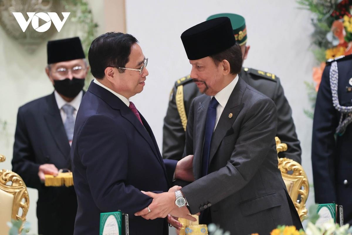 Quốc vương Hassanal Bolkiah nồng nhiệt chào mừng Thủ tướng Phạm Minh Chính.