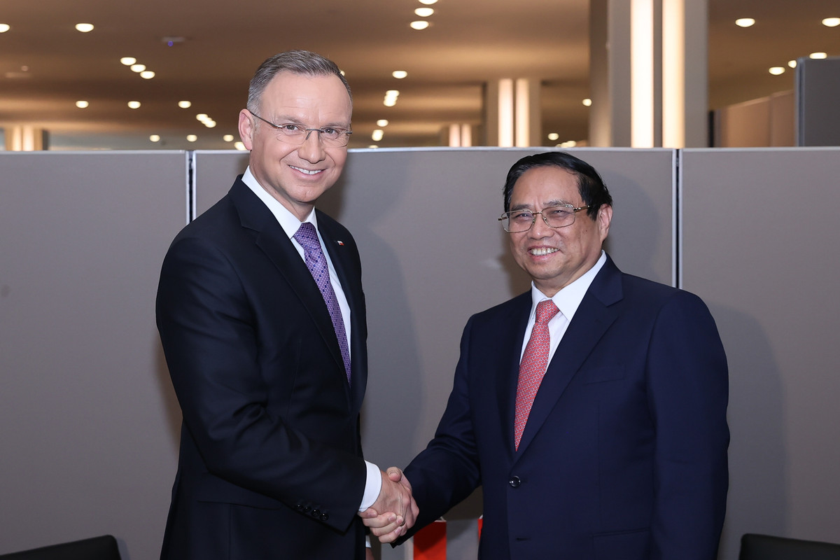 Tổng thống Ba Lan bày tỏ vui mừng gặp Thủ tướng Phạm Minh Chính và chuyển lời hỏi thăm thân tình đến các lãnh đạo cấp cao Việt Nam. Tổng thống đánh giá cao thành tựu phục hồi và phát triển kinh tế - xã hội mà Việt Nam đã đạt được sau đại dịch COVID-19.