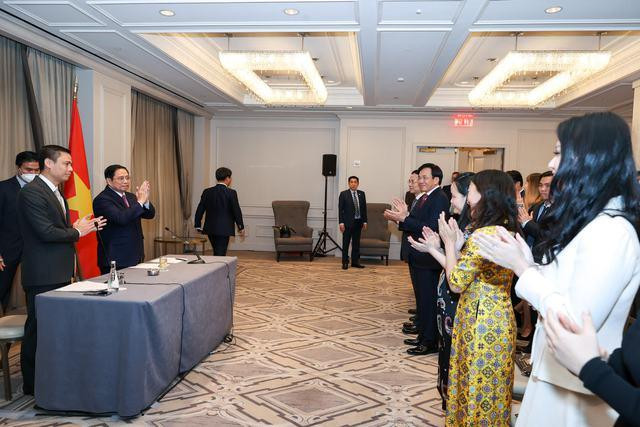 Đại diện trí thức Việt Kiều, thanh niên, sinh viên Việt Nam và cán bộ, nhân viên cơ quan đại diện Việt Nam tại New York vui mừng đón Thủ tướng Phạm Minh Chính, chiều 15/5 - (Ảnh: VGP/Nhật Bắc)