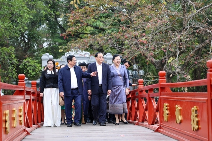 Thủ tướng Chính phủ Phạm Minh Chính và Phu nhân, cùng Thủ tướng Sonexay Siphandone và Phu nhân đã thăm đền Ngọc Sơn, dạo ngắm hồ Hoàn Kiếm. (Ảnh: Nhật Bắc)