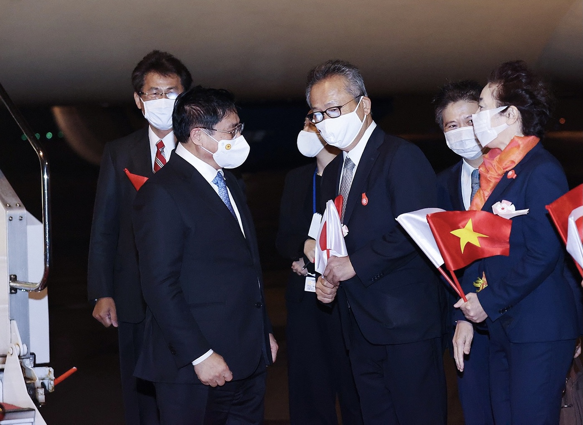 Đón Thủ tướng và đoàn đại biểu Việt Nam tại sân bay có ông Miyake Shingo, Thứ trưởng Bộ Ngoại giao Nhật Bản; bà Shino Mitsuko, Cục trưởng Cục Lê tân, Bộ Ngoại giao Nhật Bản; ông Yamada Takio, Đại sứ Nhật Bản tại Việt Nam; Đại sứ Việt Nam tại Nhật Bản Vũ Hồng Nam và một số cán bộ Đại sứ quán Việt Nam.