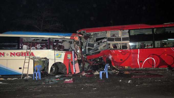 | Hiện trường vụ tai nạn thảm khốc làm 11 người chết trên quốc lộ 1 đoạn qua Khánh Hòa rạng sáng 8-3 |