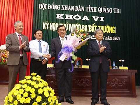 | Ông Nguyễn Đức Chính (thứ hai từ phải qua) được bầu giữ chức Chủ tịch UBND tỉnh Quảng Trị. Ảnh: VNE |