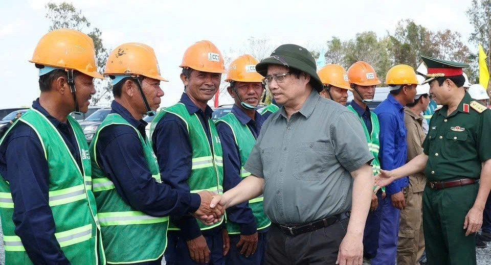 Thủ tướng thăm hỏi, động viên cán bộ, kỹ sư đang thi công dự án Cao tốc Cần Thơ-Cà Mau. (Ảnh: TTXVN)