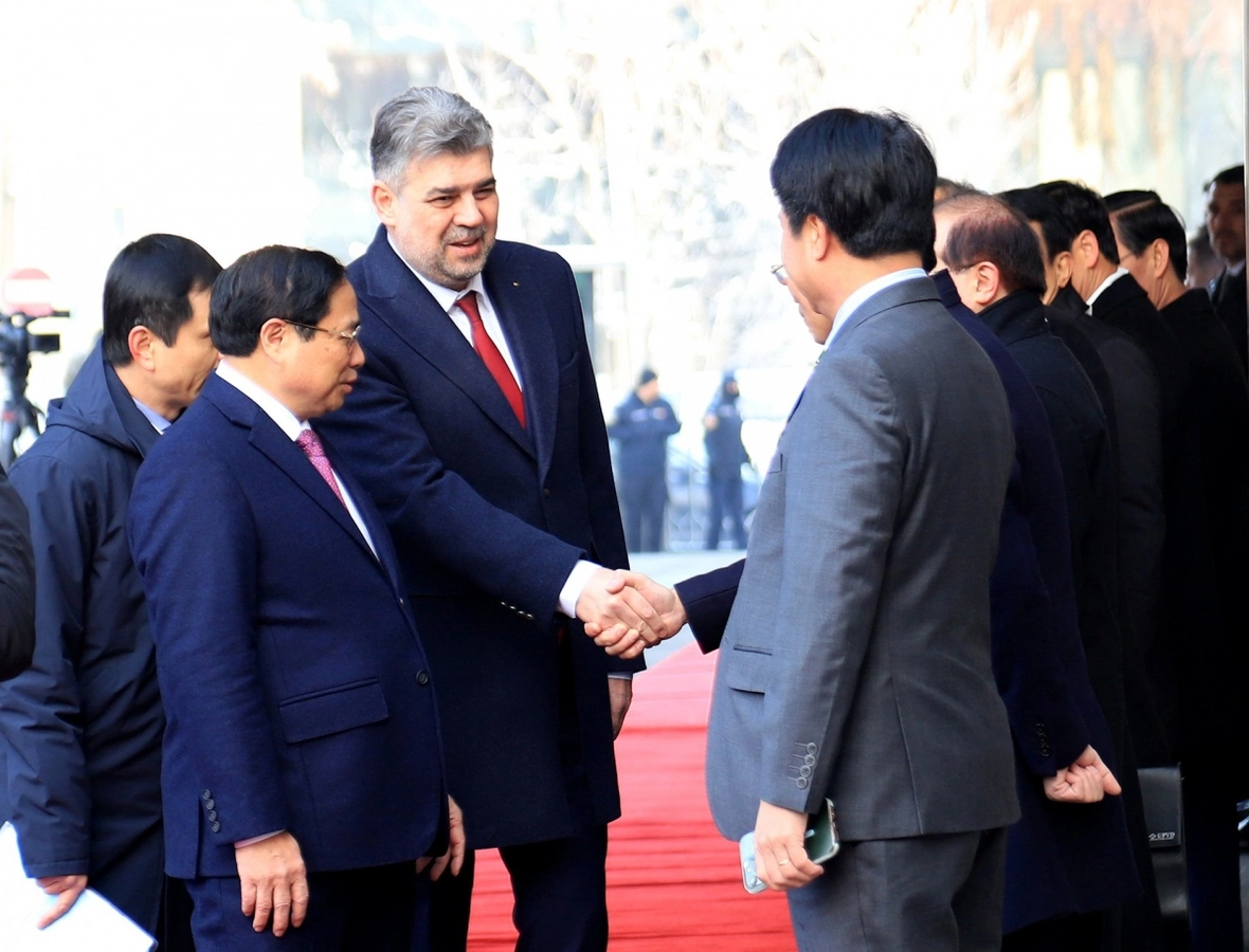 Khi đoàn xe chở Thủ tướng Chính phủ Phạm Minh Chính và đoàn đại biểu Việt Nam tiến vào sảnh Cung điện Victoria, Thủ tướng Romania Ion-Marcel Ciolacu đón và mời Thủ tướng Phạm Minh Chính bước lên bục danh dự. Trong không khí trang nghiêm tại Phủ Thủ tướng, Quốc thiều 2 nước đã được cử lên, xua tan giá lạnh mùa đông băng tuyết, tô thắm thêm tình đoàn kết, hữu nghị giữa hai nước Việt Nam - Romania.