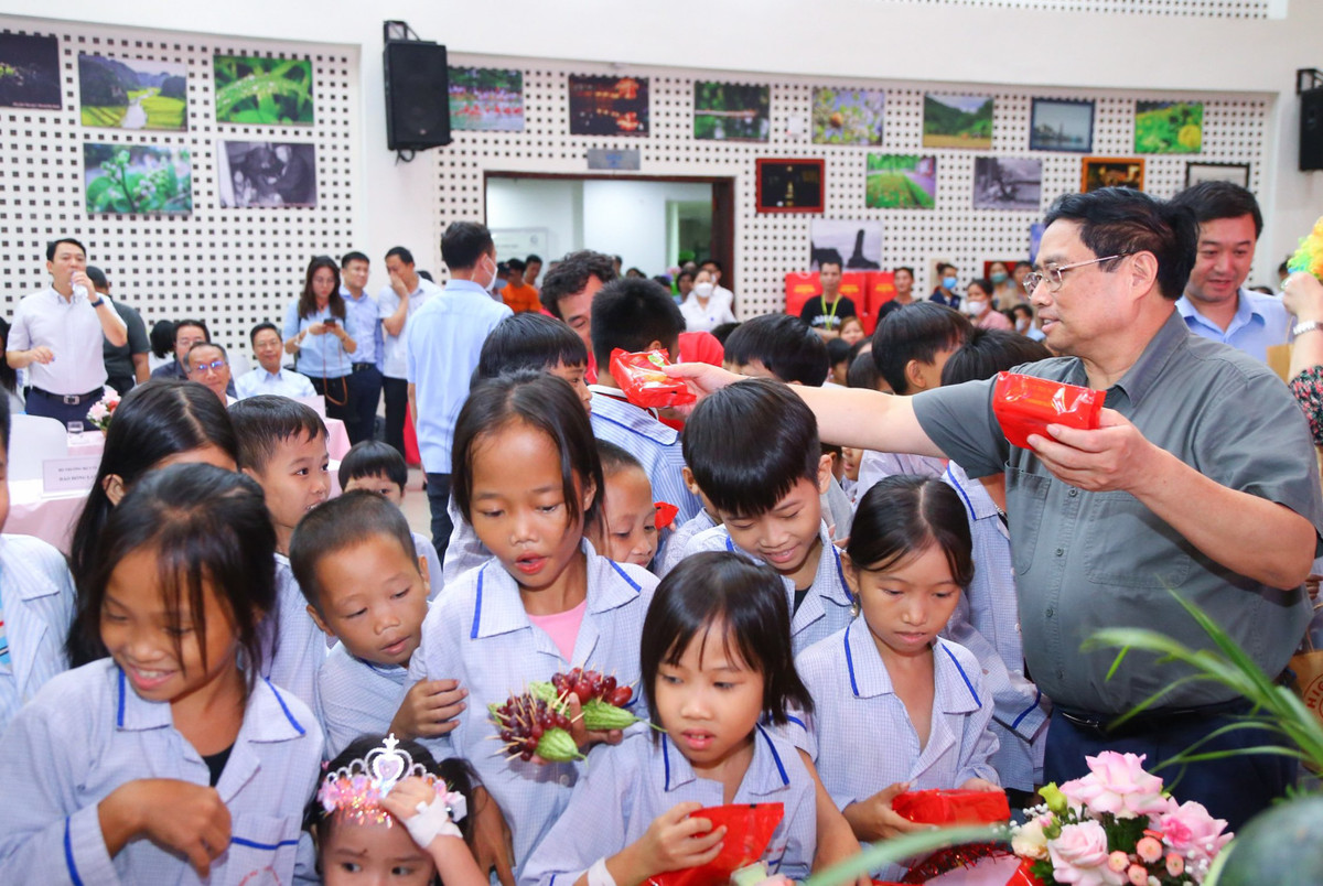 Tại bệnh viện, Thủ tướng và các đại biểu thăm hỏi, gửi lời chia sẻ, động viên và trao quà tới các bệnh nhi đang được chăm sóc, điều trị tại bệnh viện. Người đứng đầu Chính phủ động viên các em nhỏ lạc quan, kiên trì điều trị để chiến thắng bệnh tật.