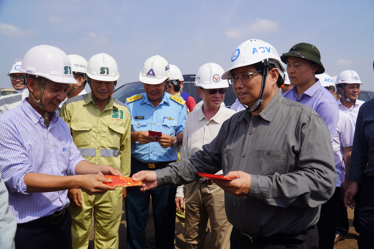 Trên đại công trường dự án sân bay Long Thành (tỉnh Đồng Nai), Thủ tướng Phạm Minh Chính thăm hỏi, chúc Tết, tặng lì xì cho đội ngũ cán bộ, kỹ sư và công nhân làm việc xuyên Tết trên công trường thuộc Nhà ga hành khách và gói thầu sân đỗ tàu bay.