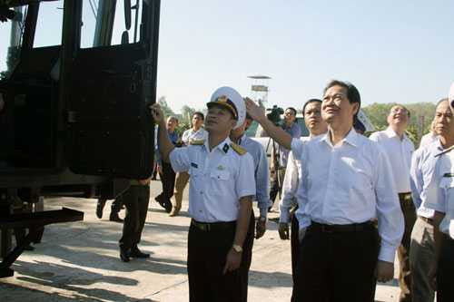 | Thủ tướng quan sát hệ thống tên lửa bảo vệ vùng biển. Ảnh Thanh Niên |