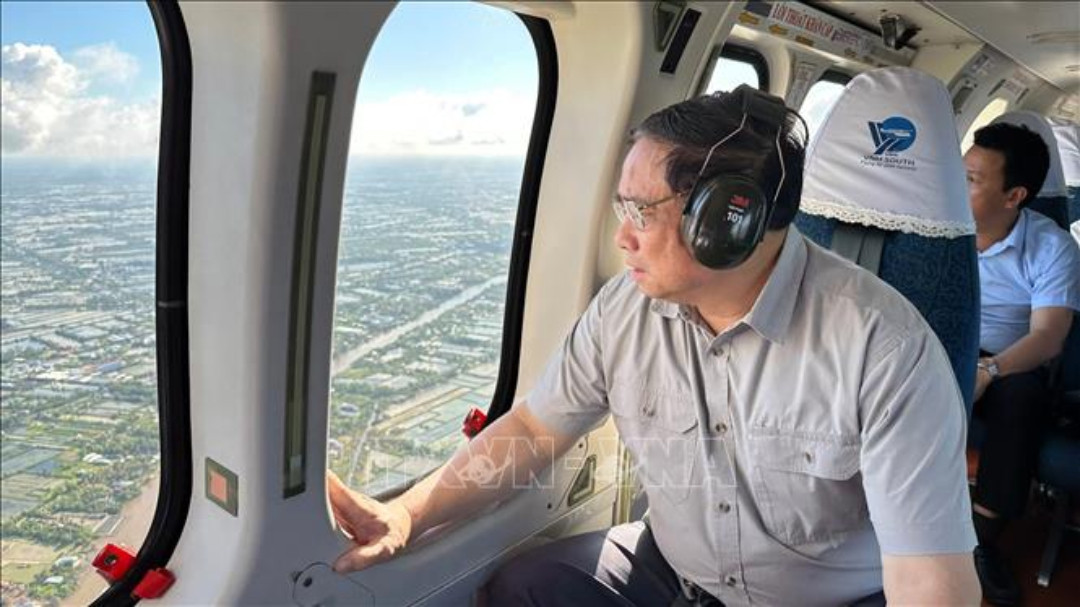 Thủ tướng Phạm Minh Chính thị sát tuyến kẻ bảo vệ khu dân cư tỉnh Kiên Giang. (Ảnh: Dương Giang/TTXVN)