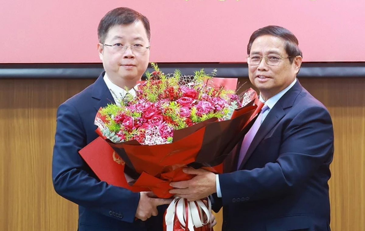 Thủ tướng Phạm Minh Chính trao quyết định bổ nhiệm và tặng hoa chúc mừng Tổng Giám đốc Đài Truyền hình Việt Nam. (Ảnh: Dương Giang/TTXVN)