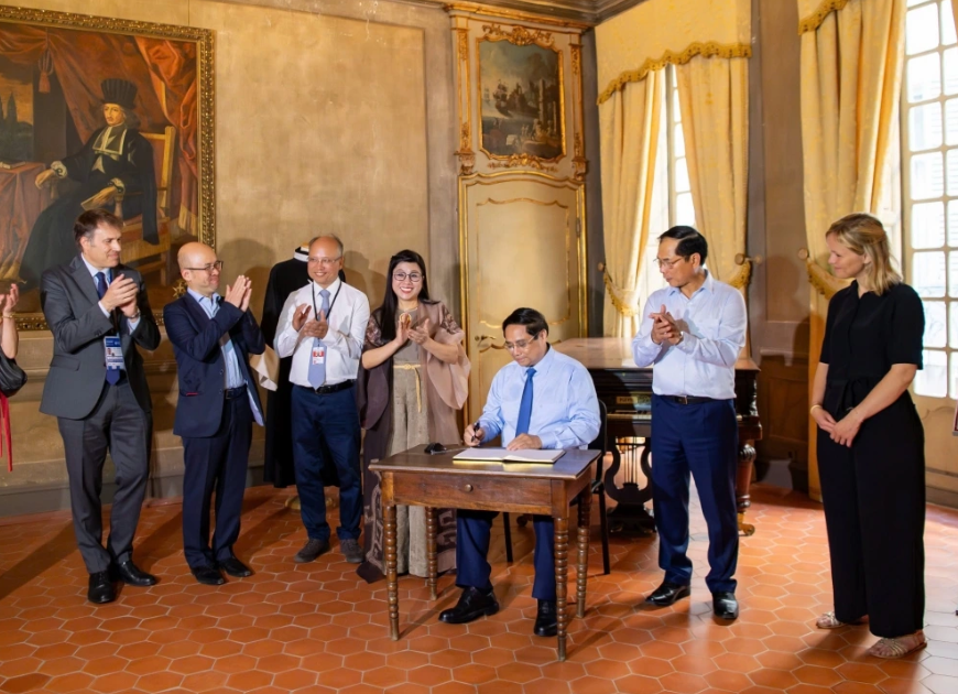 Thủ tướng Phạm Minh Chính viết sổ lưu niệm sau khi thăm Bảo tàng Lascaris (Musée Palais Lascaris)