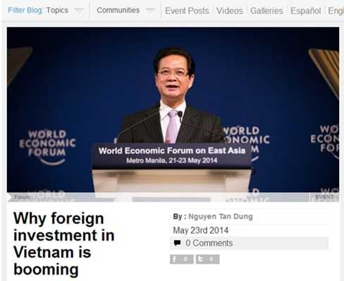 (VTC News) - Ngày 23/5, mục thông tin (blog) trên trang mạng chính thức của Diễn đàn kinh tế thế giới (WEF) 2014 đã đăng bài viết của Thủ tướng Chính phủ Nguyễn Tấn Dũng về khả năng thu hút đầu tư nước ngoài của Việt Nam.