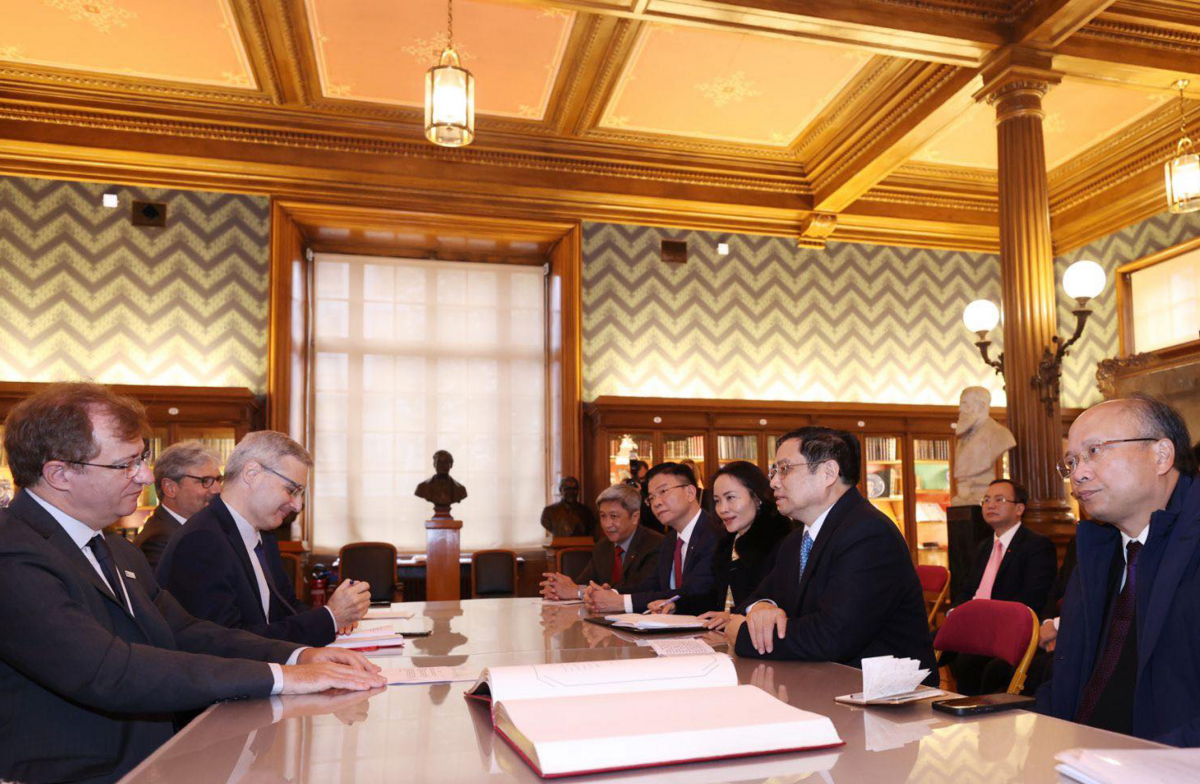 Thủ tướng Phạm Minh Chính đoàn đại biểu cấp cao Việt Nam thăm, làm việc với Viện Pasteur Paris. (Ảnh: TTXVN)