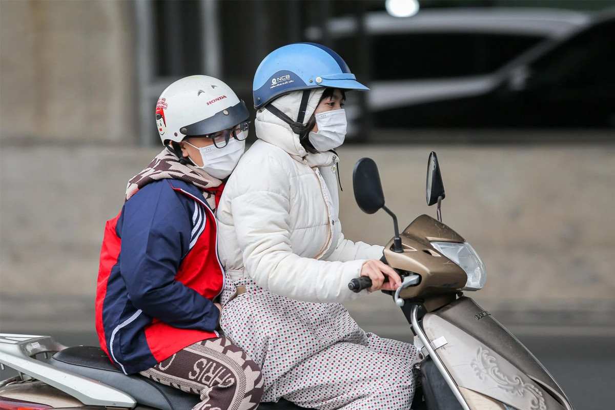 Phụ huynh Hà Nội giữ ấm cho con khi ra đường. (Ảnh: Khổng Chí)