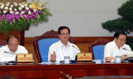 | Thủ tướng Nguyễn Tấn Dũng và hai Phó thủ tướng Nguyễn Xuân Phúc và Hoàng Trung Hải tại phiên họp Chính phủ ngày 1/4. (Ảnh: Vietnamnet) |