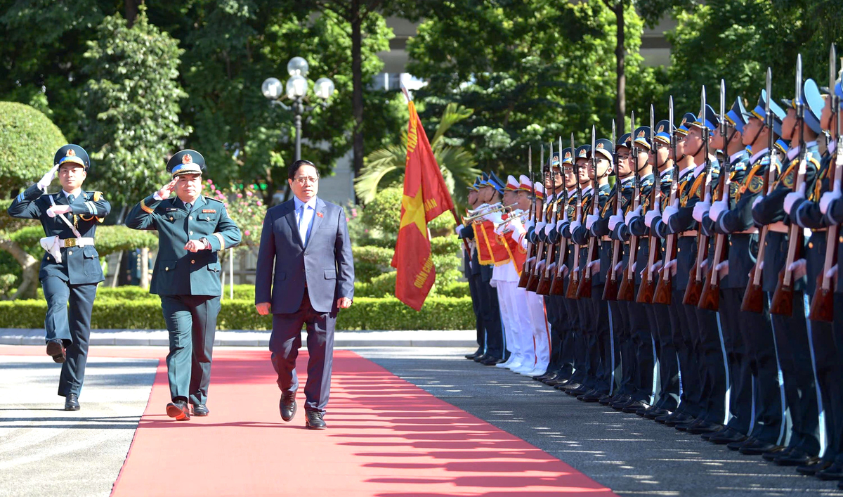 Thủ tướng Phạm Minh Chính duyệt đội danh dự Quân chủng Phòng không - Không quân. (Ảnh: Viên Minh)