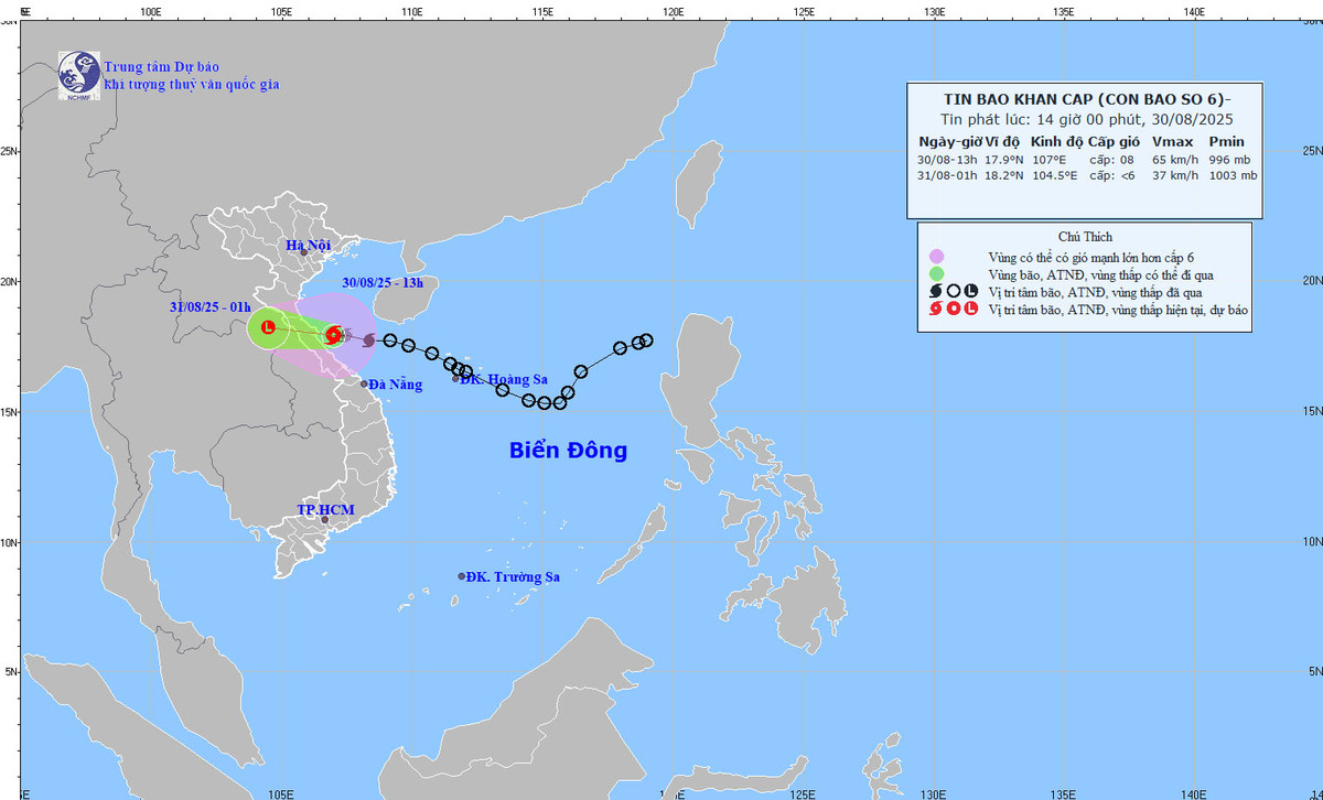 Theo dự báo của Trung tâm Dự báo khí tượng thủy văn quốc gia chiều tối nay (30/8) bão số 6 sẽ đi vào đất liền các tỉnh Hà Tĩnh - Bắc Quảng Trị, đây là những khu vực đã chịu tác động bão, mưa lũ do ảnh hưởng của bão số 5.