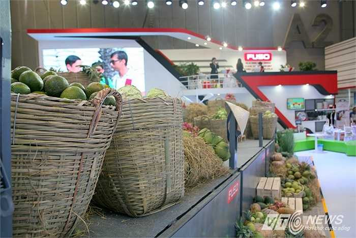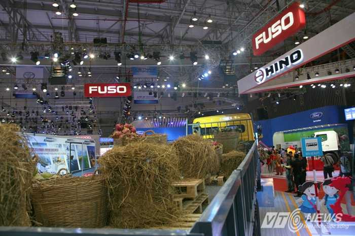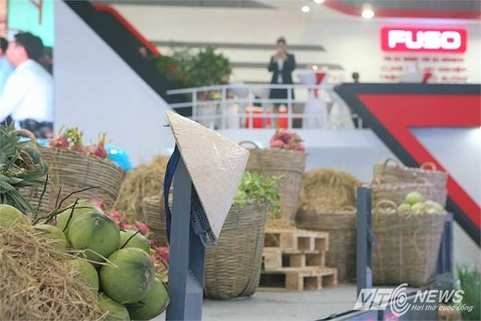 Khoảng hai chục loại nông sản như bí ngô, dừa, thóc lúa, khoai sắn...được mang đến triển lãm trưng bày, làm nổi bật chiếc xe tải đa dụng Fuso.
