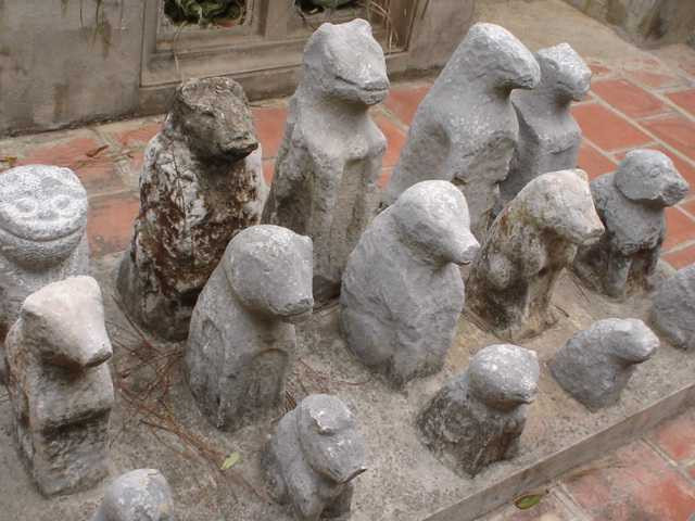 Ngày xưa, nhìn vào con chó đá ngồi ở cổng là người ta có thể nhận biết gia đình đó là giàu có, sang hèn ra sao. Những nhà giàu, có thế lực, am hiểu phong tục thường thuê thợ khéo đục chó đá to lớn, giống chó thật, cổ đeo cả chuông, khánh. Những trọc phú thì thường chơi chó gốm, đẹp, to, dữ dằn, bệ vệ, thể hiện sự giàu có về vật chất. Đức "nhà sàn" cũng như đại gia đình anh thì chỉ thích loại chó đá mà dân chúng "nuôi". Loại chó đá này chỉ mang dáng dấp của con chó chứ không thật giống. Để làm ra nó, người ta không cần có lý thuyết, mô hình gì, chỉ cần vài đường đục đẽo đơn giản cho ra hình dáng.