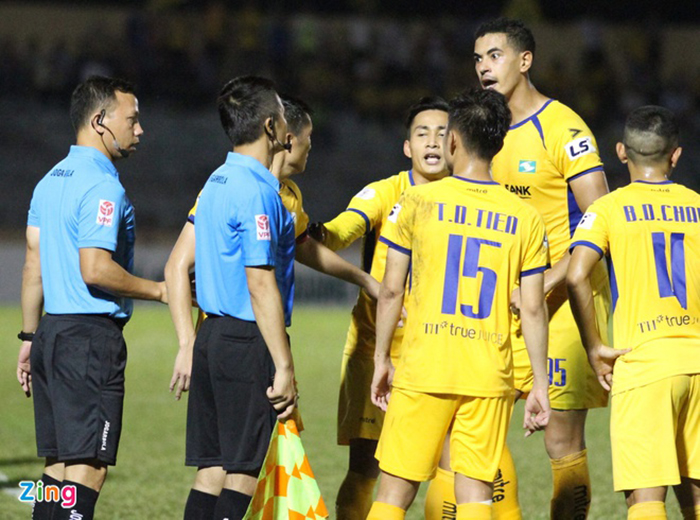 Cầu thủ SLNA liên tục vây lấy trọng tài để phản ứng.