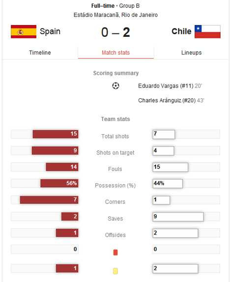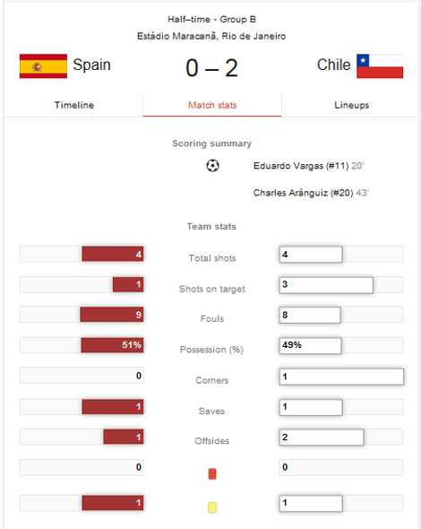 Cú sốc từ trận thua 1-5 trước Hà Lan ở ngày ra quân đã khiến Tây Ban Nha vào trận với Chile bằng một tâm lý rất nặng nề. Không những vậy họ còn gặp phải lối chơi pressing của Chile và không thể làm chủ thế trận.