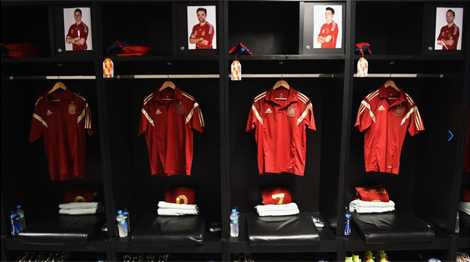 | Phòng thay đồ của ĐT Tây Ban Nha. Họ sẽ ra sân với trang phục màu đỏ |