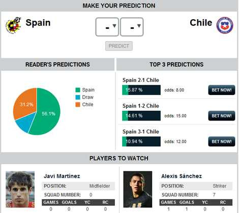 20': VÀO... VÀO... VÀO... Lưới của Tây Ban Nha đã rung lên sau một loạt những tình huống phối hợp của các cầu thủ Chile. Người đã bình tĩnh lừa qua thủ thành Casillas rồi kết thúc chính là Vargas. Trong khi đó người mắc sai lầm ở tình huống chuyền về dẫn đến pha phản công của Chile là Alonso. Khó khăn đã thêm chồng chất với Tây Ban Nha.